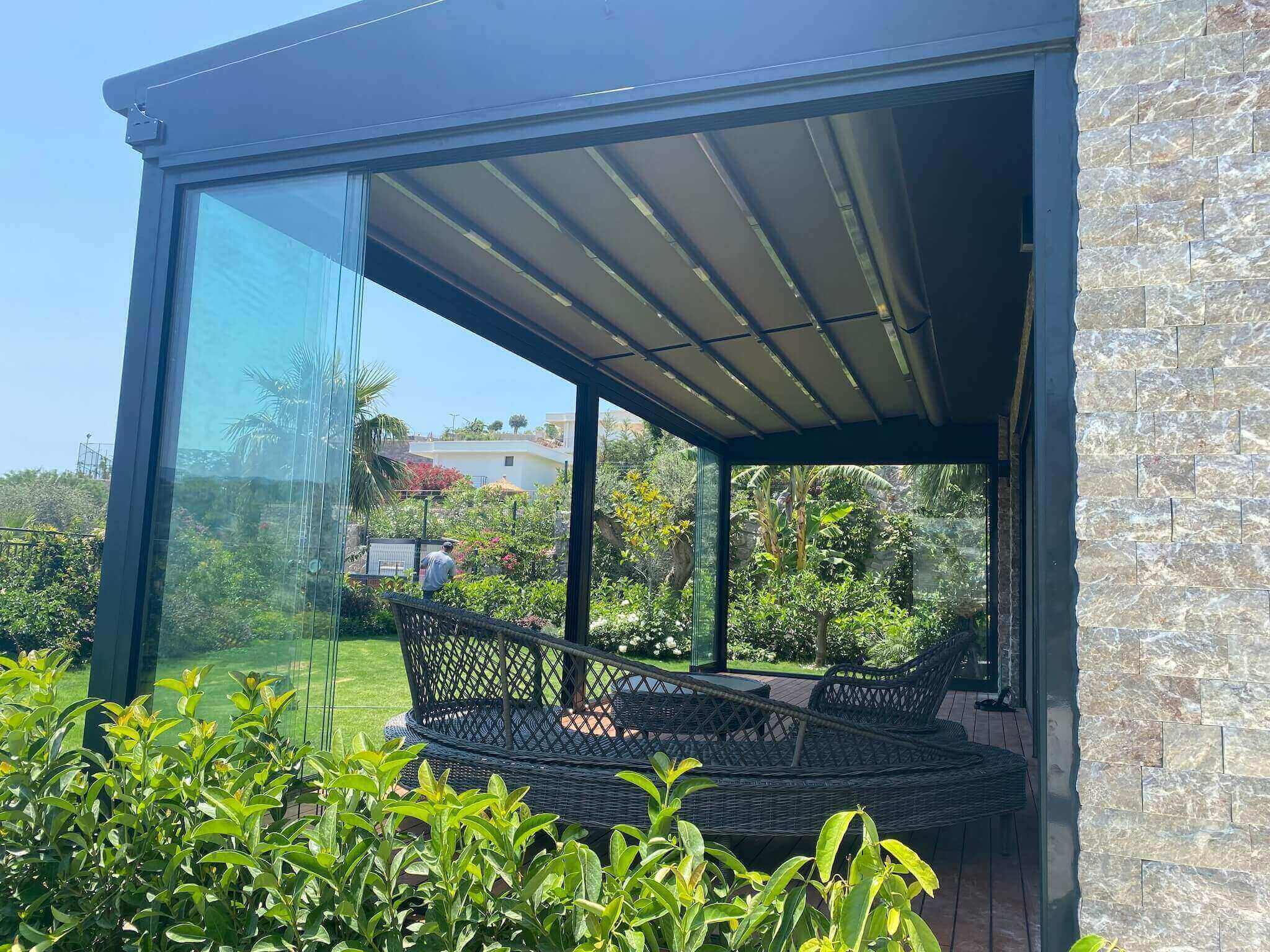 Otomatik açılır pergola sistemi ile ışık ve gölge kontrolü kullanıcı dostu hale getirildi.