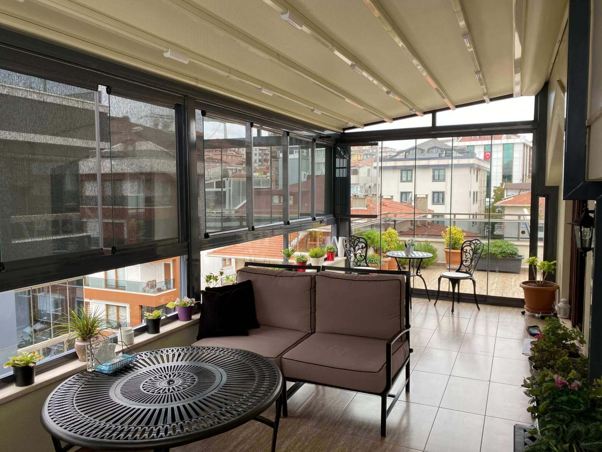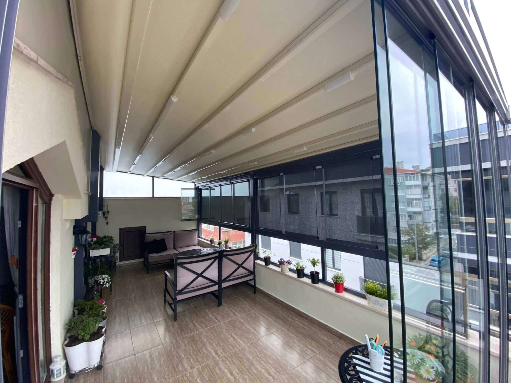 Otomatik açılır-kapanır pergola sistemi ile teras alanı gölgelendirme ve yağmur koruması sağlayacak şekilde donatıldı.